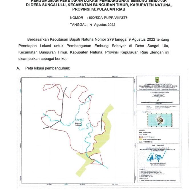 PENGUMUMAN PENATAPAN LOKASI PEMBANGUNAN EMBUNG SEBAYAR DI DESA SUNGAI ULU, KECAMATAN BUNGURAN TIMUR, KABUPATEN NATUNA